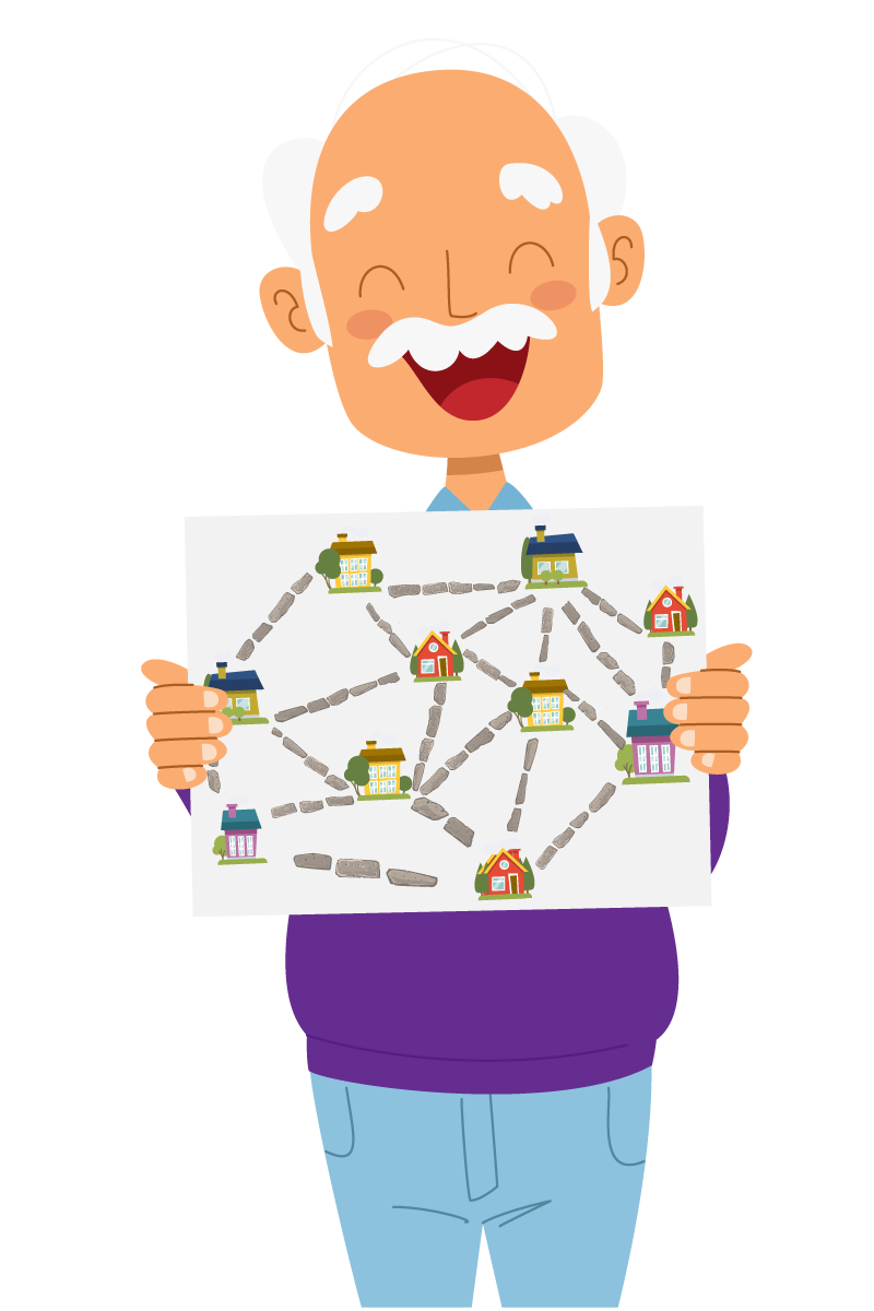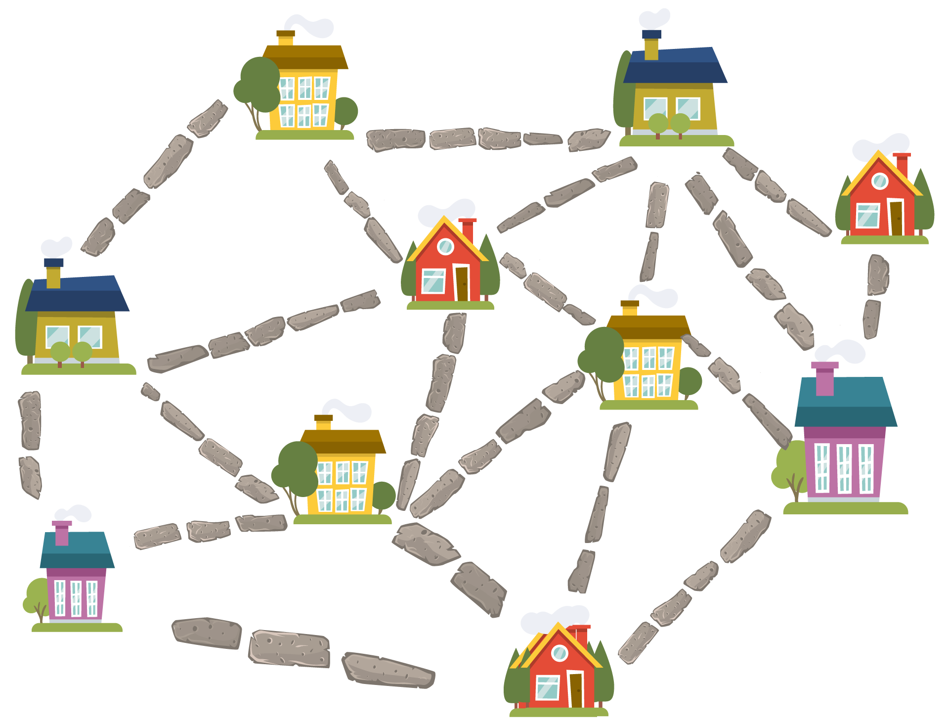 - Es müssen genügend Straßen repariert sein, damit jeder von seinem Haus zu jedem anderen Haus nur über gepflasterte Straßen gelangen kann.